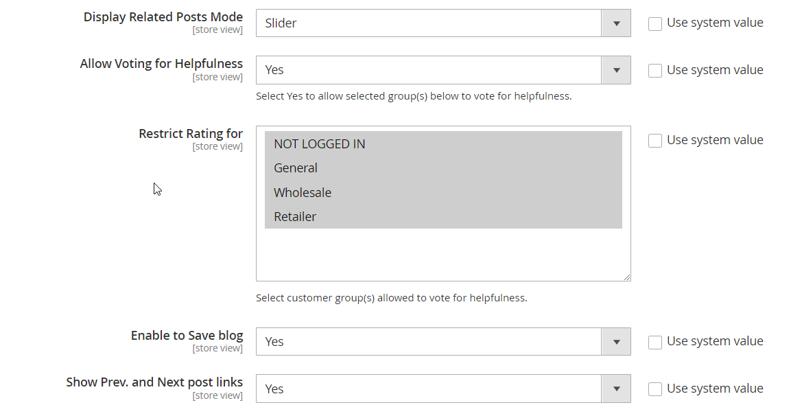 - Restrict Rating for: Select the customer group that is allowed to vote (Like/Dislike). You can select multiple groups.
