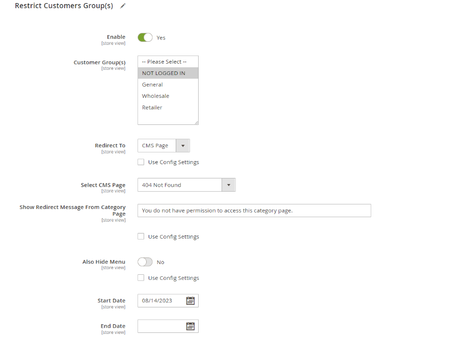 Yesis selected, it will enable Restrict Category with the category you choose. Show more fields: Restriction Customers Group(s), Redirect To fields, Also Hide Menu, Start Date, End Date. - Selecting