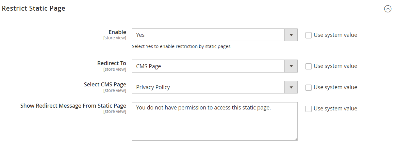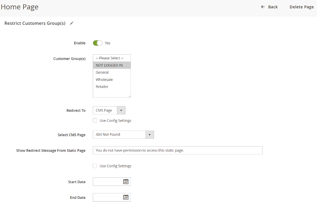 Yesto enable Restrict Static Page and will display a new field Customer Group Restriction under the Content tab when accessing theCatalog> Page.Redirect To: Select the page you want to redirect to after accessing the restricted Static Page: