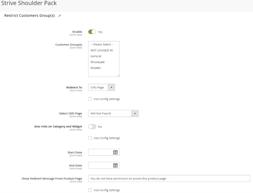 Show Redirect Message From Product Page: Display the message to notify redirecting from the Product page. If you put a tick on the Use Config Settings field, then the system will display the message set in the Module Configuration.