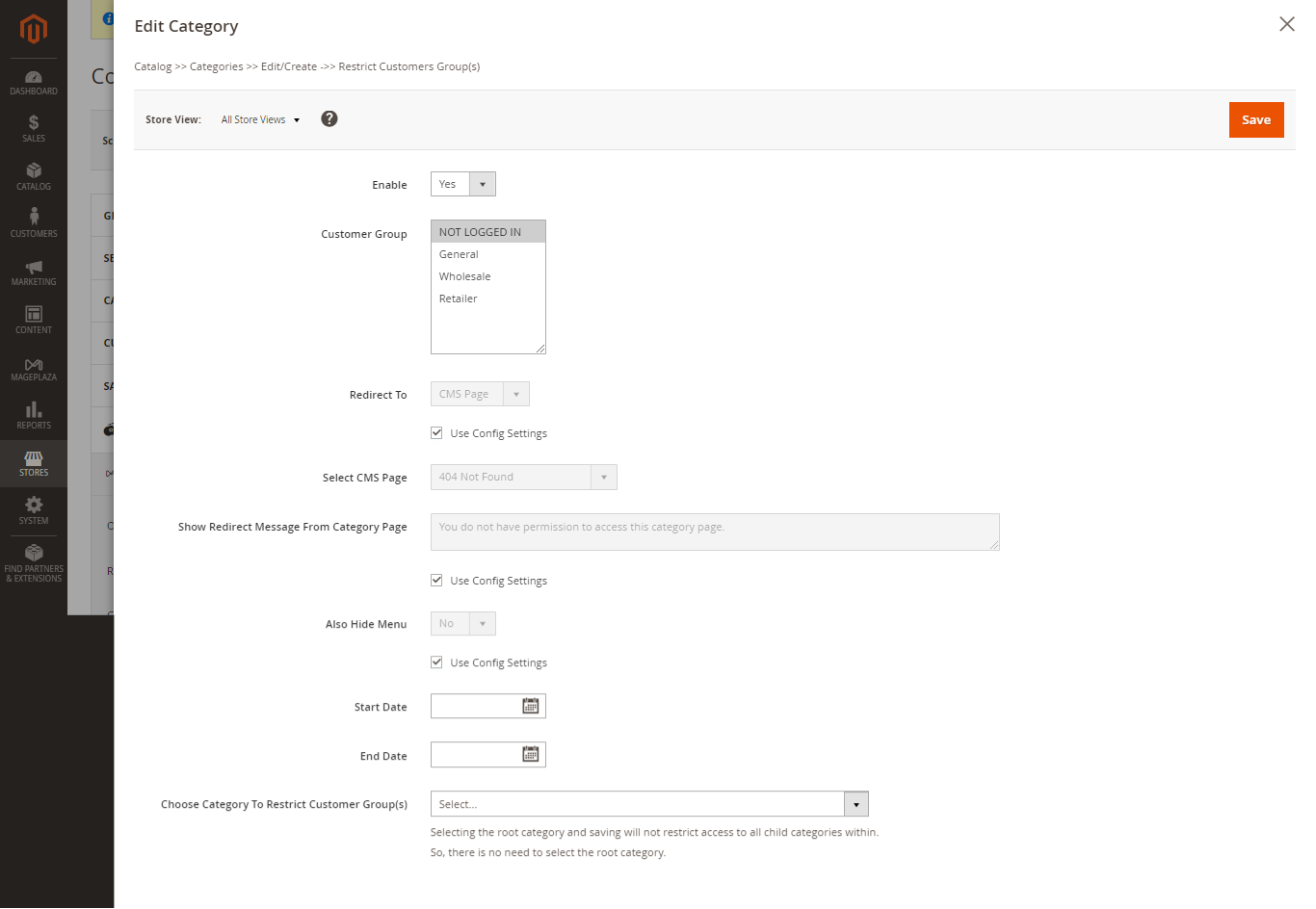 CMS Page: Display the Select CMS Page field to select the CMS Page to be redirected to when accessing the restricted category.