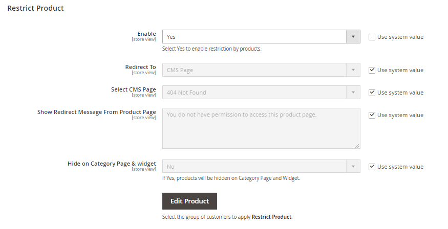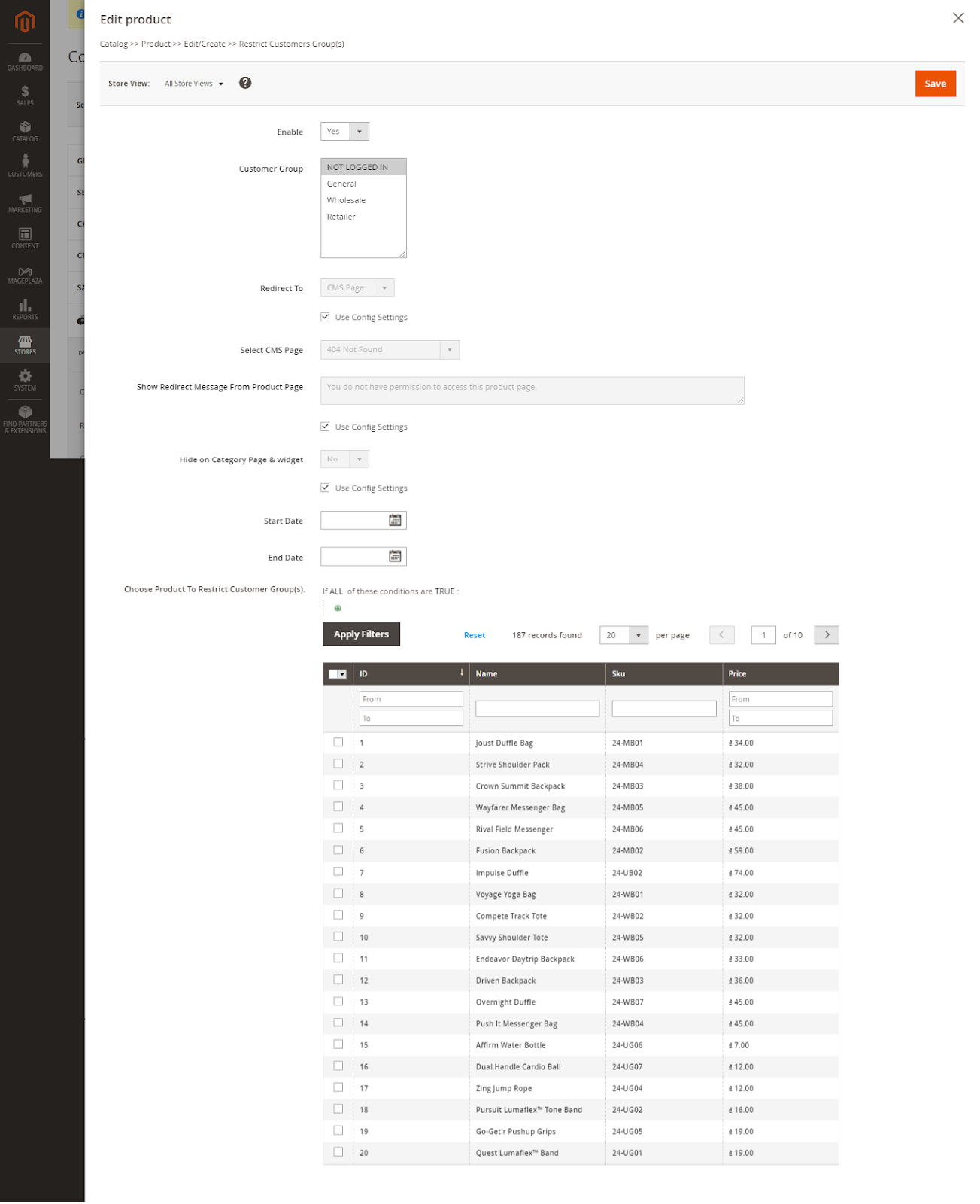 CMS Page: Display the Select CMS Page field to select the CMS Page to be redirected to when accessing the restricted Product.
