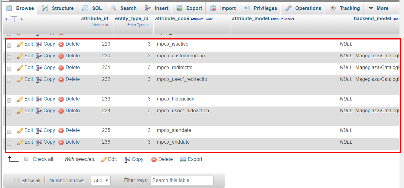 eav_attributetable. In theattribute_codecolumn, find and delete thempcp_isactive, mpcp_customergroup, mpcp_redirectto attribute, mpcp_usecf_redirectto, mpcp_hideaction, mpcp_usecf_hideaction, mpcp_startdate, mpcp_enddate.
