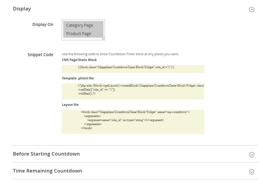 - Layout file: Copy the code and insert it into Magento's .xml file or other extensions you want to display Countdown Timer.