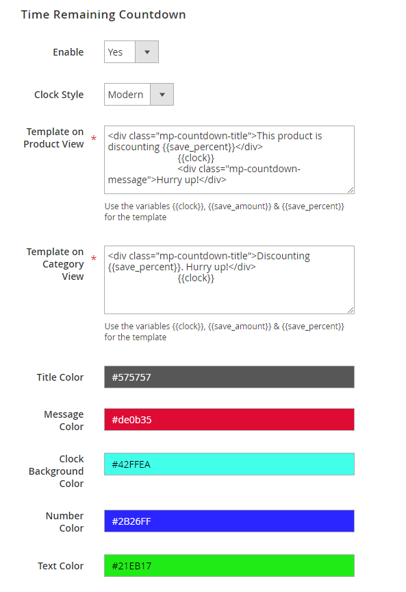 <div class="mp-countdown-message">Hurry up!</div> .- **Template on Category View**: Insert the variables `{{clock}}, {{save_amount}} & {{save_percent}}` allow showing countdown timer at **Category View** while running sales with the default template:<div class="mp-countdown-title">Discounting {{save_percent}}. Hurry up!</div>