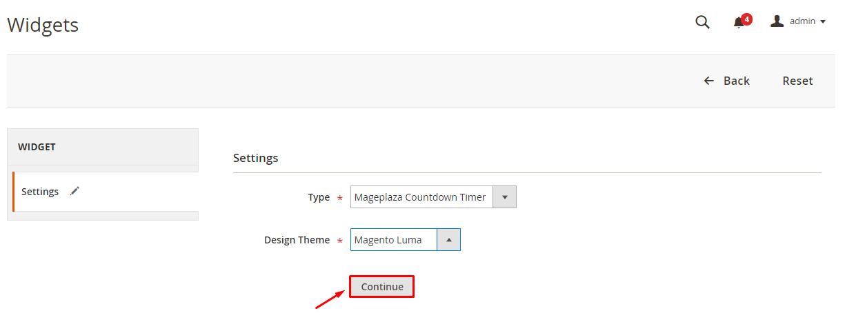 Step 2: Select Type = Mageplaza Countdown Timer, choose the current theme at Design Theme, then click to Continueâ