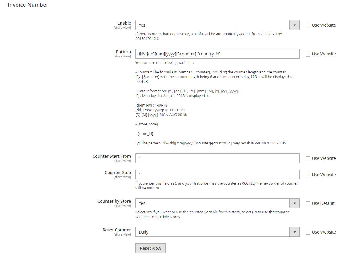 Counter Start Fromvalue that is using instantly. For example,Counter Start Fromfield is 10000 now,Counter Stepis 5. After a long time to order and click onReset Now, the ID of the next invoice after resetting will start fromCounter Start From + Counter Stepvalues.