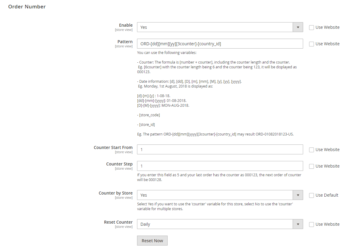 - [store_id]: The format for the ID will be displayed as the symbolic number for the created order of the store views