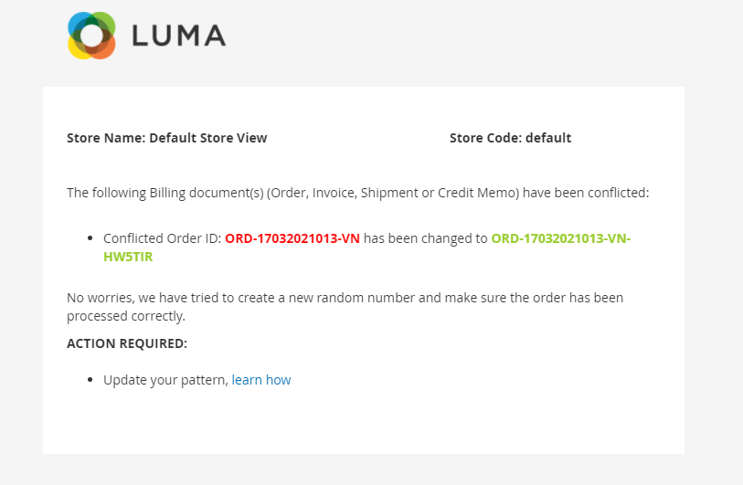 - When the ID of the order, invoice, shipment or credit memos of the next time duplicates with the ID of the previous times, the ID will be automatically added to the variable [6AN] at the back and at that time, there's an email to notify the store owner that the ID of the order, invoice, shipment or credit memos is existing and is replaced by the new ID.