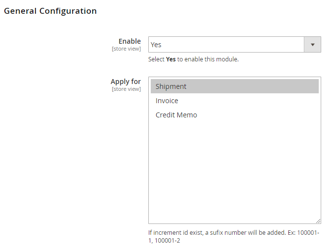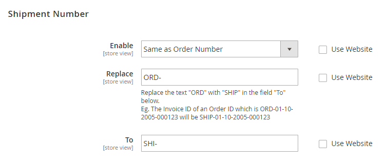 - If you choose No, the shipment ID of different stores will be merged and increased in succession based on the configuration of Main Website. For instance: Store A has 50 shipments and the shipment ID is 50, store B don't have any shipment. When customers purchase the products in the store B, the shipment ID of store B is 51.