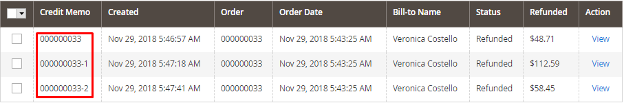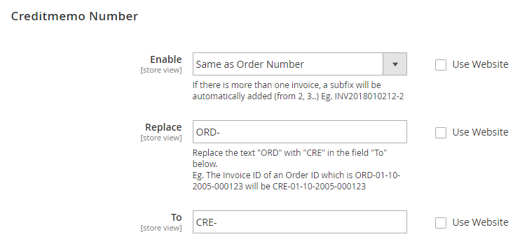 - If you choose No, the credit memo ID of different stores will be merged and increased in succession based on the configuration of Main Website. For instance: Store A has 50 credit memos and the credit memo ID is 50, store B don't have any credit memo. When customers purchase the products in the store B, after this order is refunded, the credit memo ID is 51.