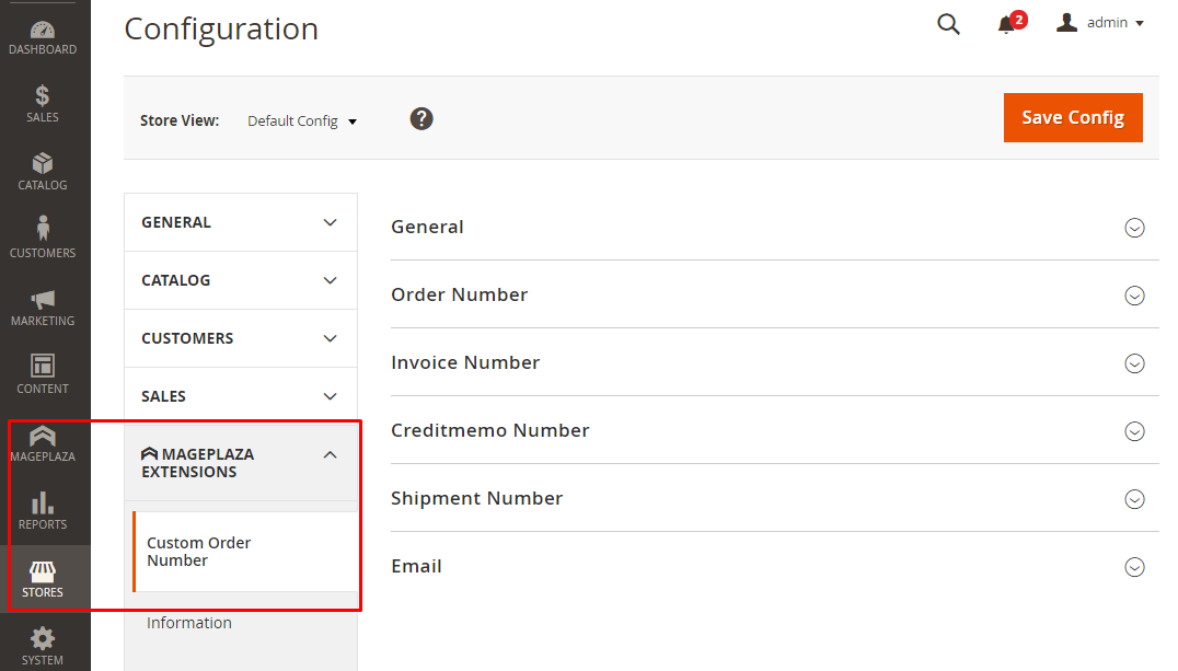 Login to the Magento Admin, choose Store > Settings > Configuration > Mageplaza Extensions > Customer Order Number