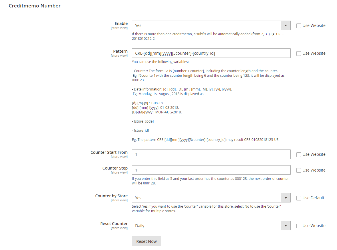 Counter Start Fromfield, after entering a new value and saving, admins need to click onReset Nowbutton so that the credit memo ID can get a newCounter Start Fromvalue.
