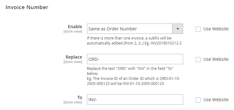 - If you choose No, the invoice ID of different stores will be merged and increased in succession based on the configuration of Main Website. For instance: Store A has 50 invoices and the invoice ID is 50, store B don't have any invoice. When customers purchase the products in the store B, the invoice ID of store B is 51.