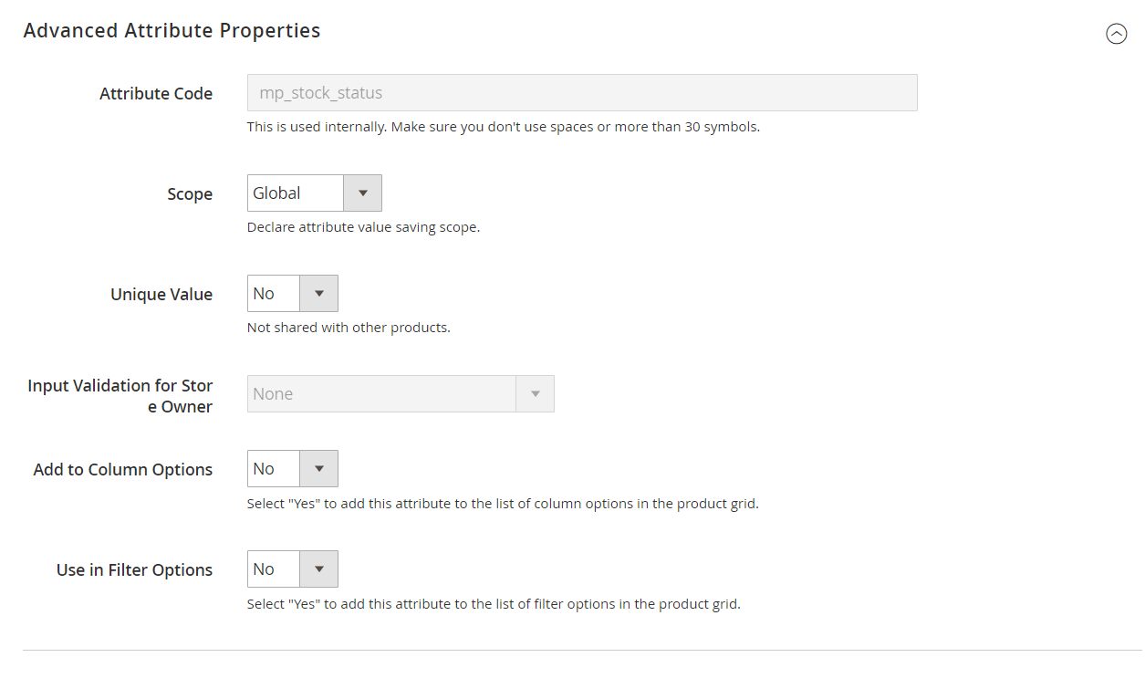 - This section is similar to the Custom Stock Status section, you can configure the display position of attributes. With the Attribute Code and the Validation Input type for Store Owner field are both the default value.
