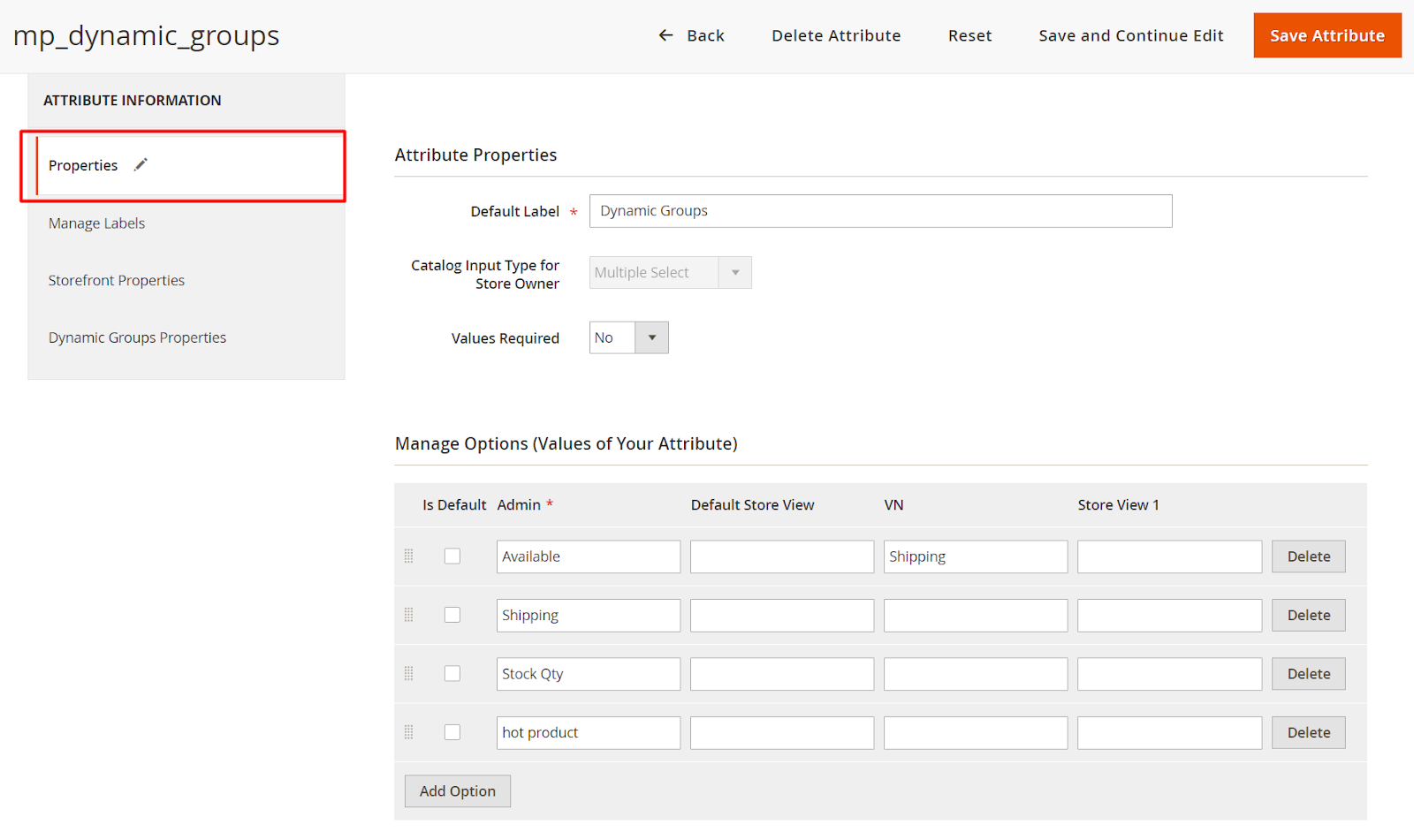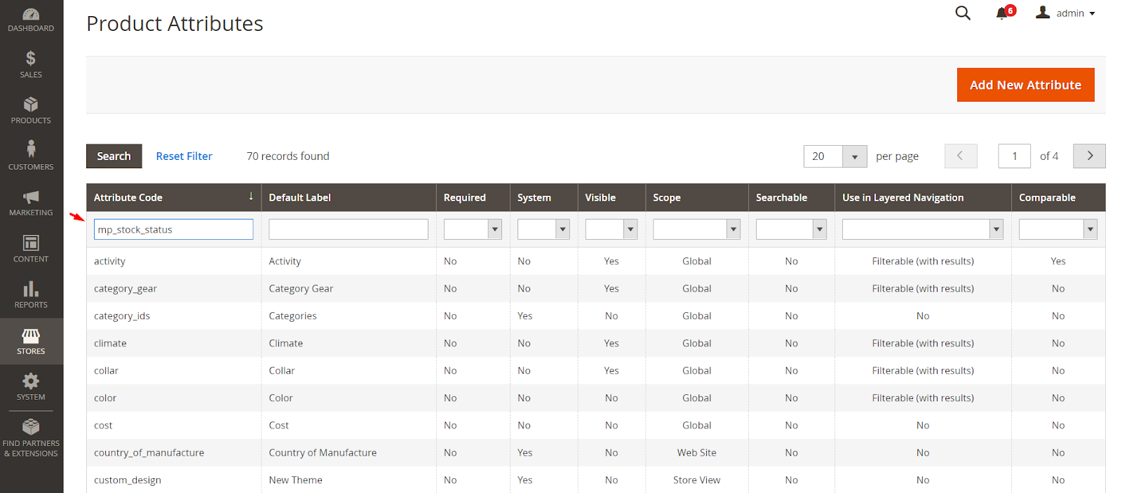 Go to the backend: From the Admin Panel, go to Stores> Attributes> Product. In the Attribute Code column, find the attribute mp_dynamic_groups and mp_stock_status, click and delete
