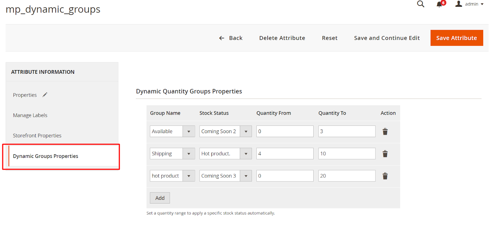 Stores> Custom Stock Status> Manage Dynamic Quantity Groups. Or you can visitStore> Attributes> Product, search in Attributes Code field withmp_dynamic_groups.For Dynamic Group, it only applies to Simple Product and if the product satisfies Dynamic Group, it will give priority to consider or apply Dynamic Group first.