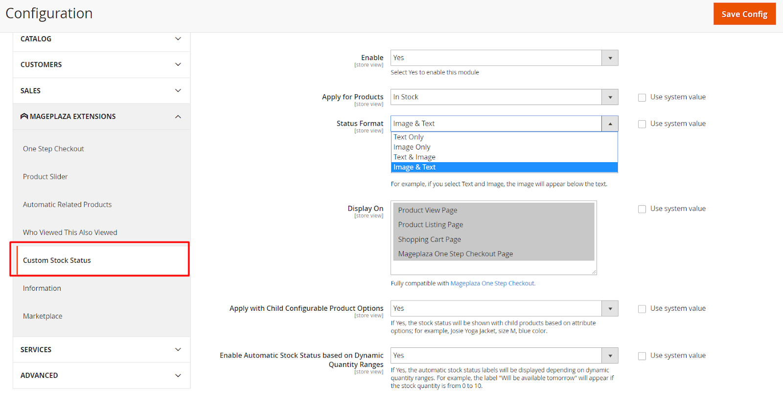 Note: If you select the Visual Swatch, you can display both the label and image outside the Frontend for Custom Stock Status, depending on the selection of the Status format field at Configuration.