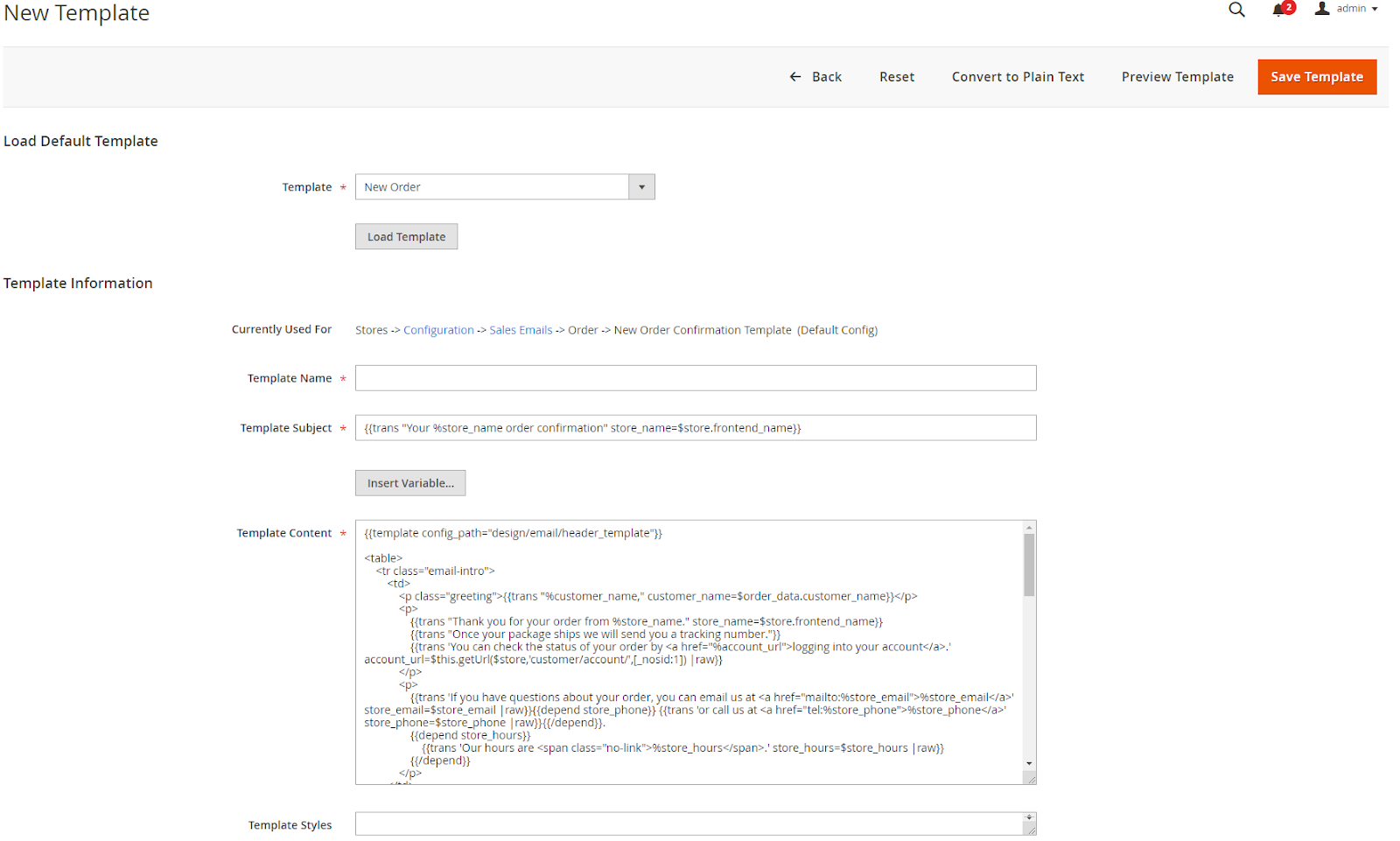 Marketing > Communications > Email Template. chooseAdd New Template(or edit template if you want) - Load Template from New Order email