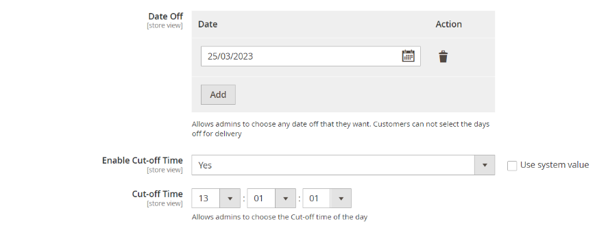 - Enable Cut-off Time: Set Yes to allow limiting the delivery time deadline, which will depend on the Cut-off Time field below.