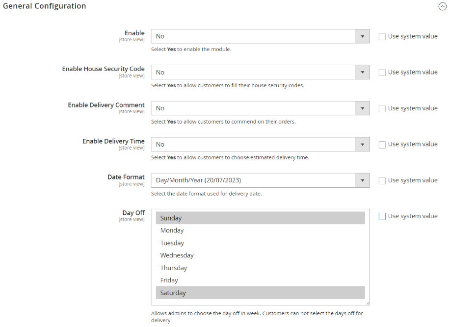 Login to Magento Admin, go to Stores > Settings > Configuration > Mageplaza Extensions > Delivery Time > General Configuration