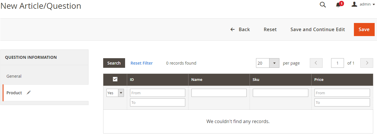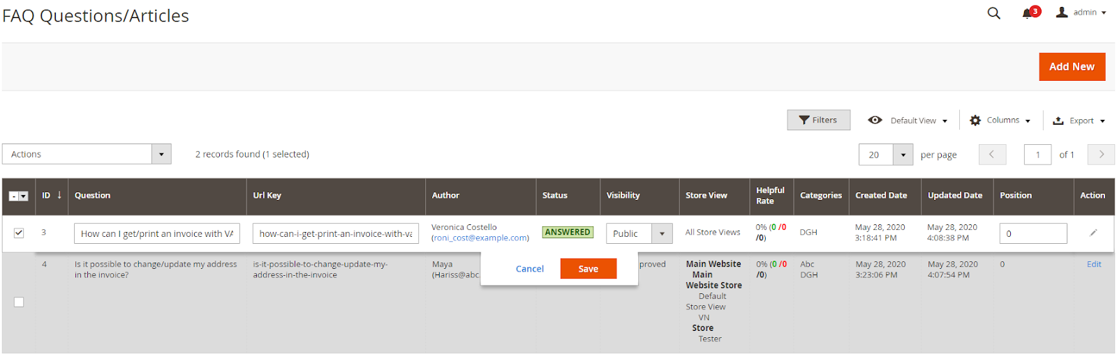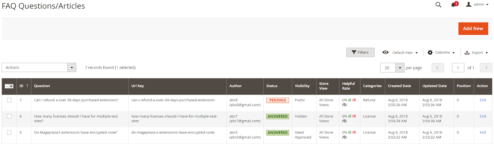ID, the content and URL of the question, who created the question, the status of the question (answered or not), Visibility (public, hidden, need approved), displayed store view, Helpful rate, Create date, Update date, Position, and Action. - Admins can perform some actions as the following: