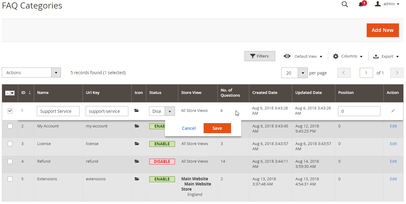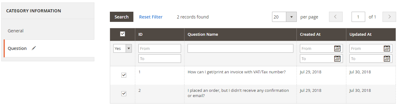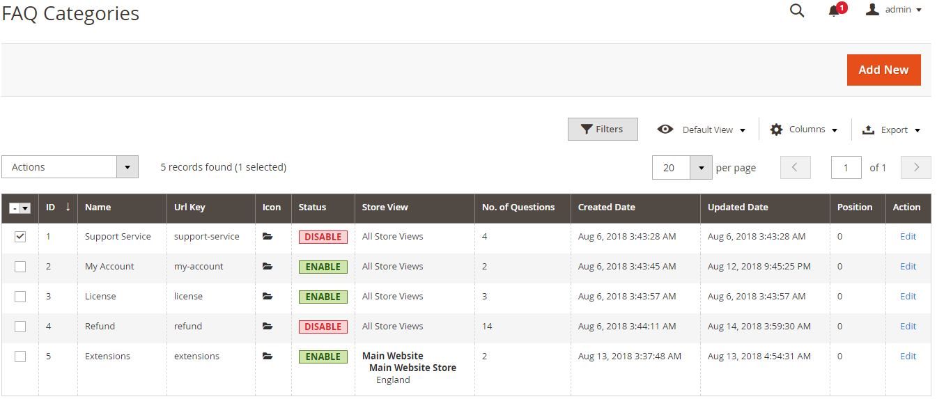 ID, the name and URL of the question, icon of the Category, the status of Category, Store View, the number of questions, Create Date, Update Date, Position, and Action. - Admins can perform some actions as the following: