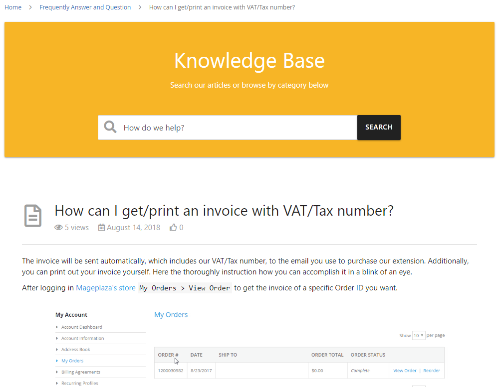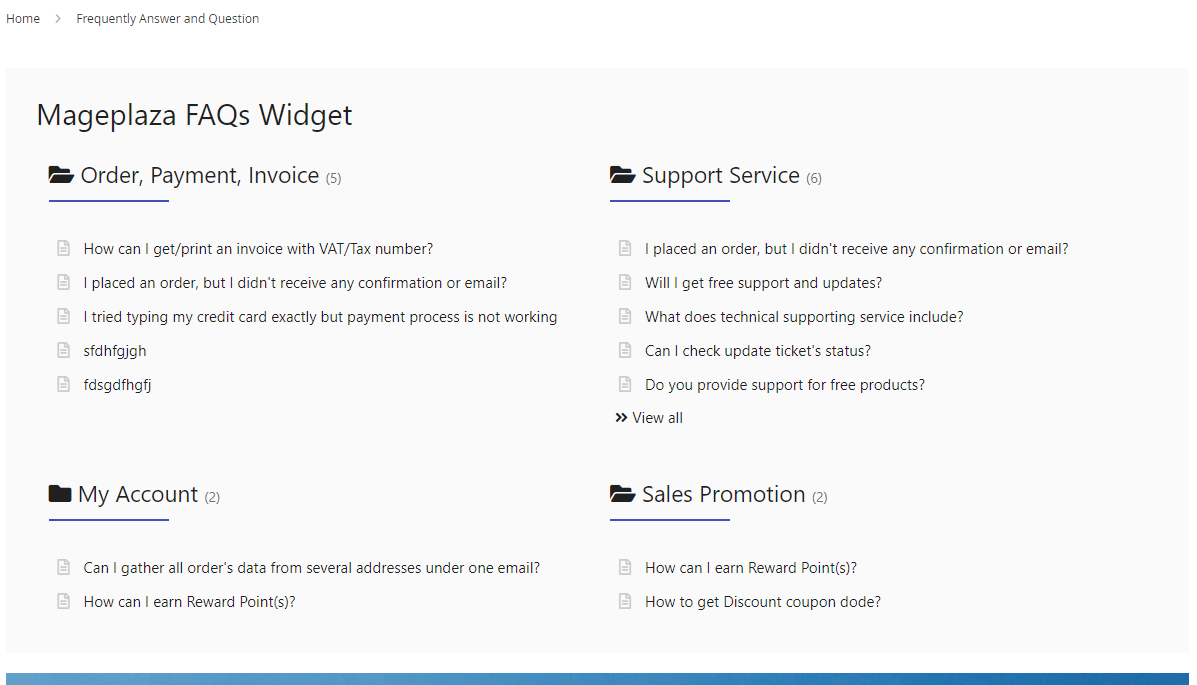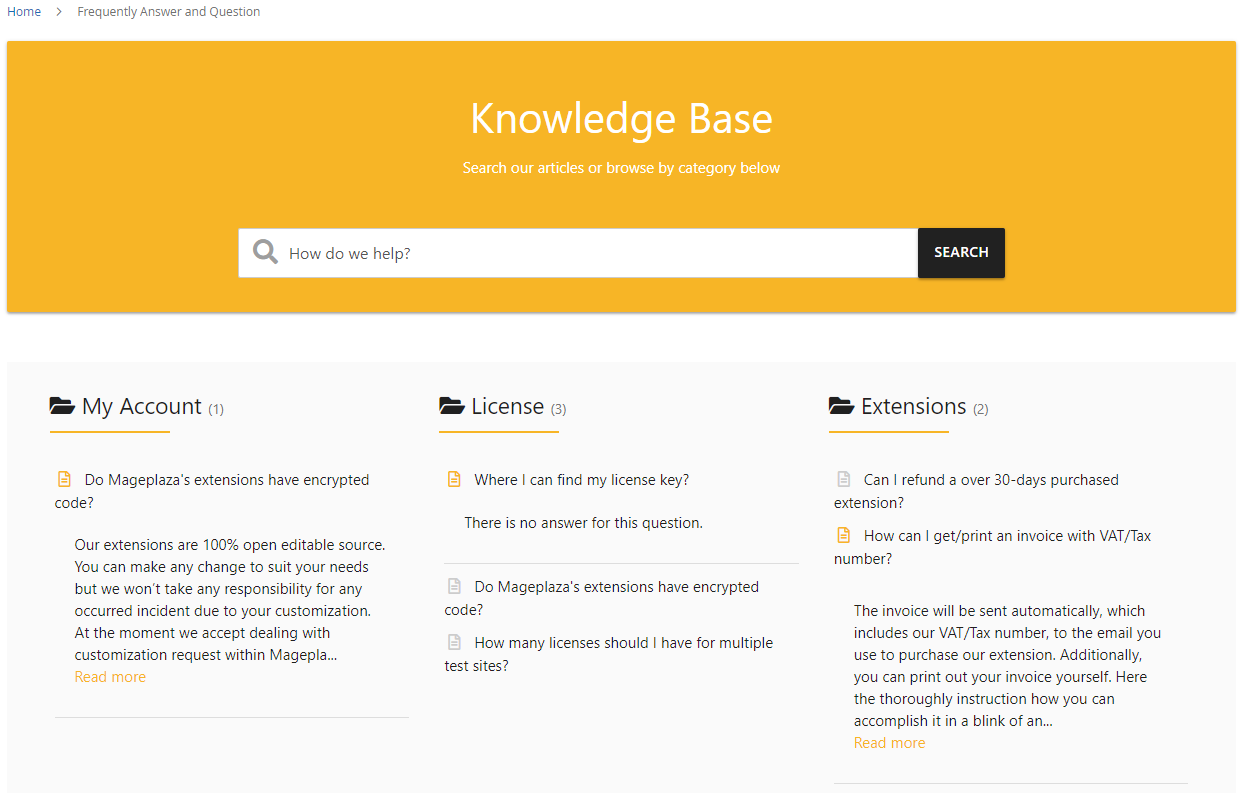 - Depending on the installation of admins, FAQ Homepage will display Search box or not. Customers can search any question on FAQ Homepage quickly when using Seach box.