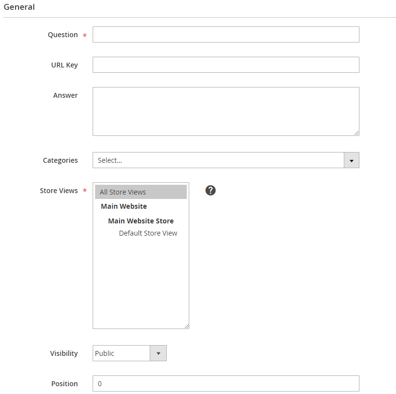 - Position: This field stipulates the order to display the question on FAQs Homepage, FAQs Category, and FAQs Product Tab.