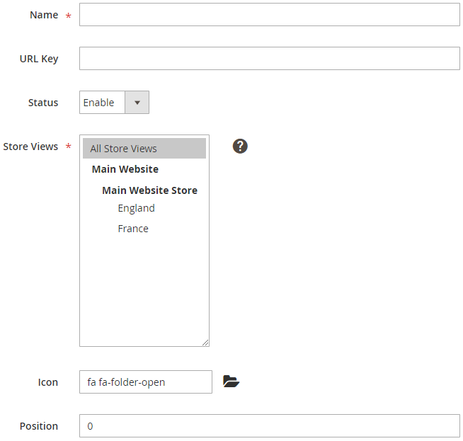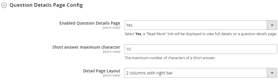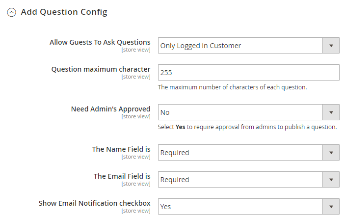 - Store Views: A website can have many store views. Questions are only displayed with selected store views.