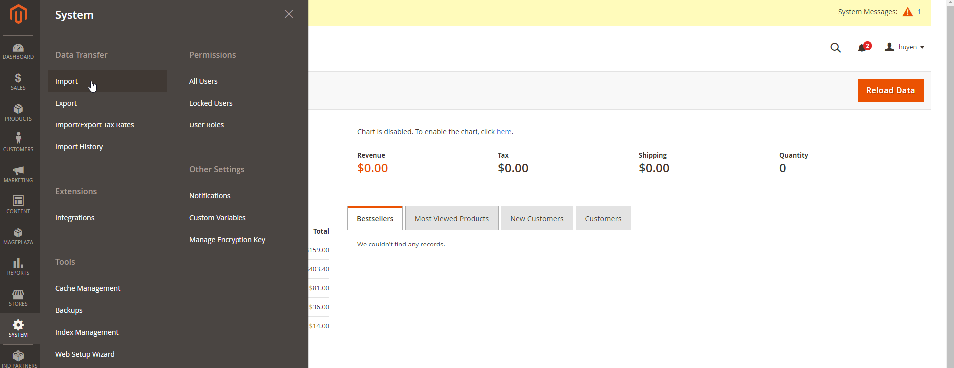 At the Import page, choose the extension you need to input Gift Code(s). At Import Settings, choose Entity Types = Mageplaza FAQ Categories, or Entity Types = MageplazaFAQ Articles. Then the Import Behaviour and File to Import sections will be displayed.