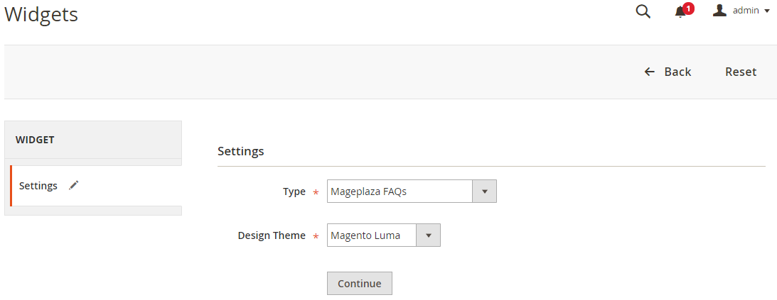 Type = Mageplaza FAQs,Design Theme = Magento Luma. After that, select Continue