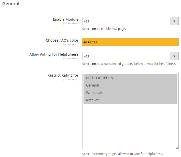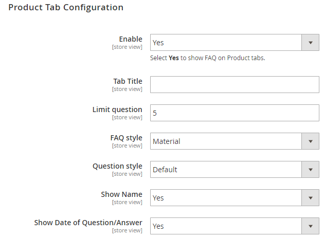- Enable: Choose Yes so that FAQ Tab can display in the Product Info Detail Box
