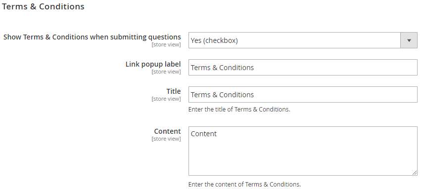 Submit Question formunder the text. At this time, customers default to accept the term & condition of the store ownerLink popup label: The name of popup Terms & Conditions. When clicking on the popup label, the popup that contains the content of Terms $ Conditions will be displayed