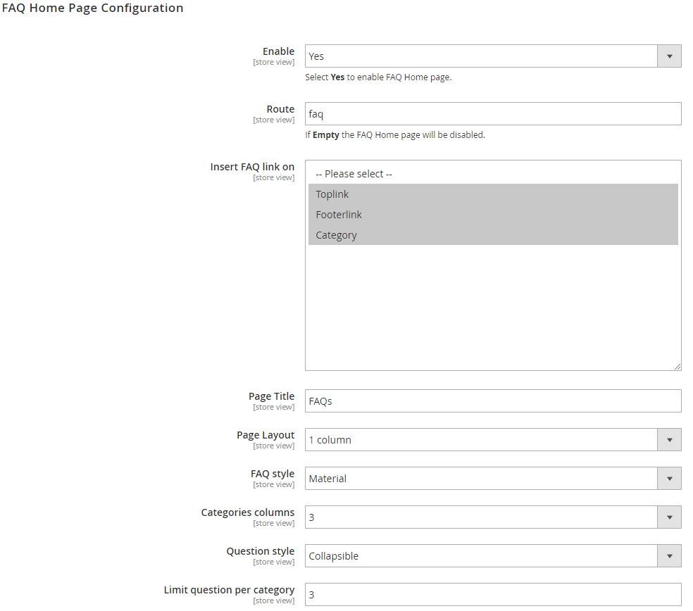 Route: The route of FAQ Homepage is entered in this field. If leaving it blank, FAQ Homepage will be disabled