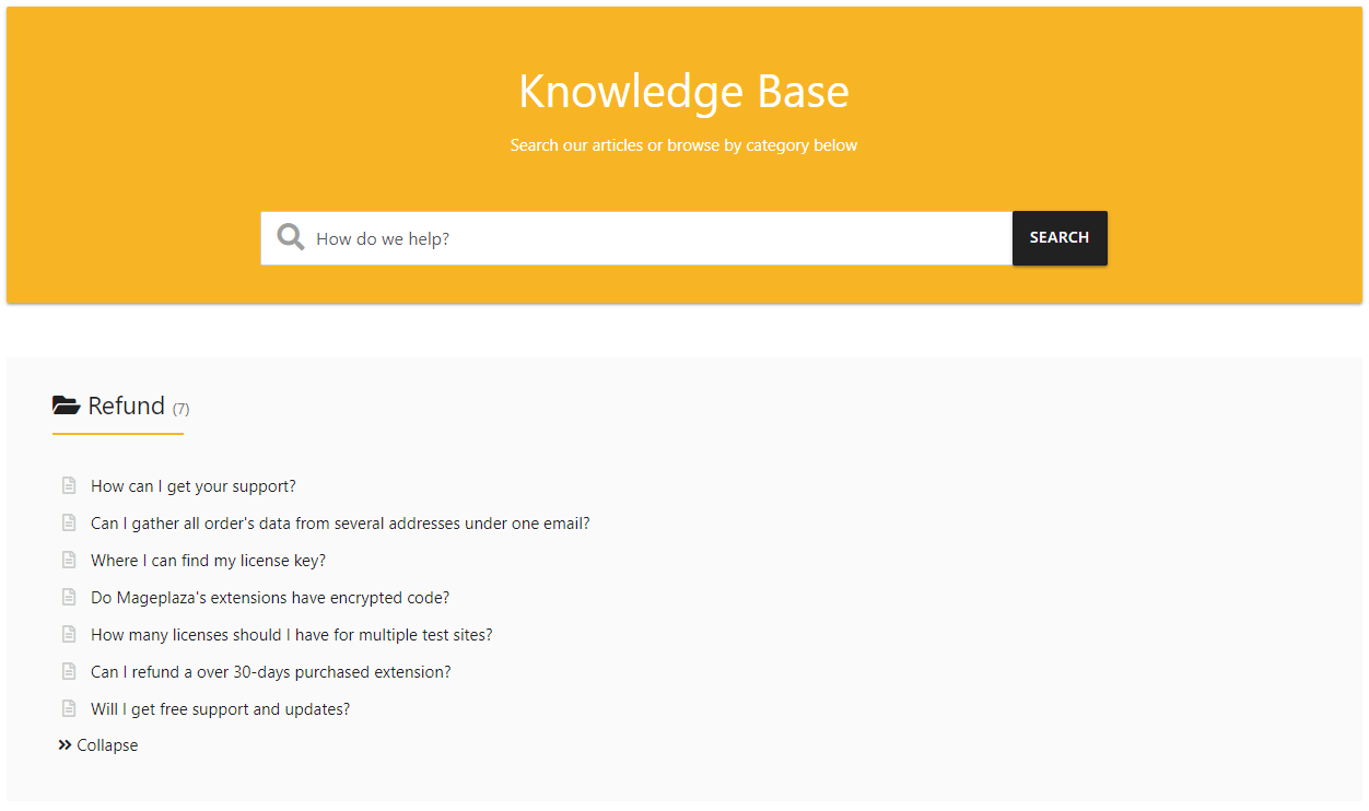 - Collapsible: On the FAQ Homepage, the answers will be collapsed with their questions. The answer only will be displayed if customers click on the question, and it will be hidden if the question is clicked again.