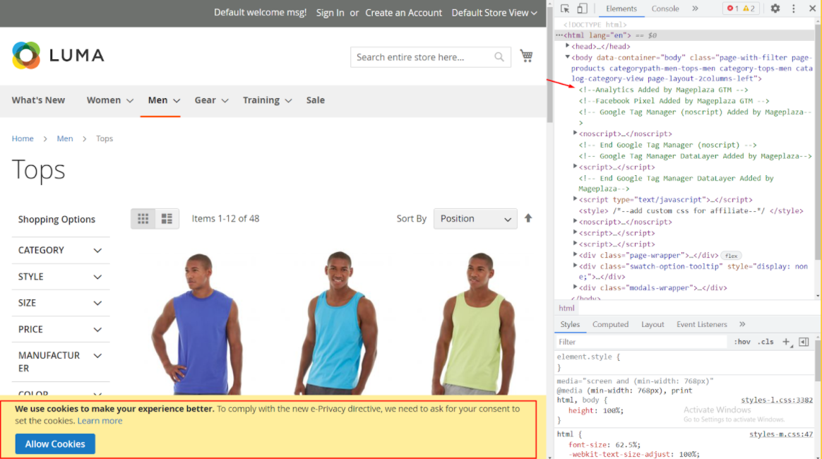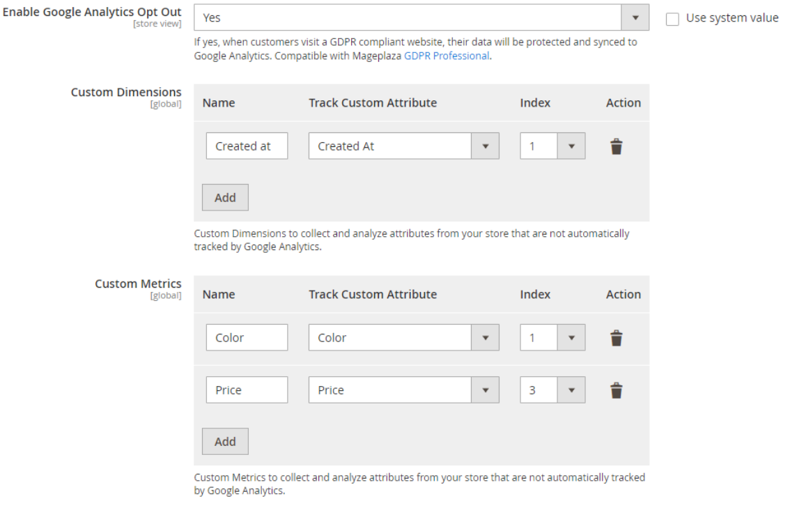- Enable Google Analytics Opt Out: Select Yes so that when customers enter your website, if they do not follow and accept cookies, the data will not be synced to Google Analytics, and if they do, the data will be synced to Google Analytics. This can help customers protect their information and reduce unnecessary data. This feature is compatible with Mageplaza GDPR Professional.
