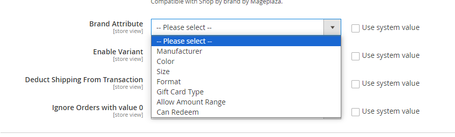 - Brand Attribute: There are seven attributes: manufacturer, color, size, format, gift card type, allow amount range, and can redeem. Brand will be set according to the selected Attribute.