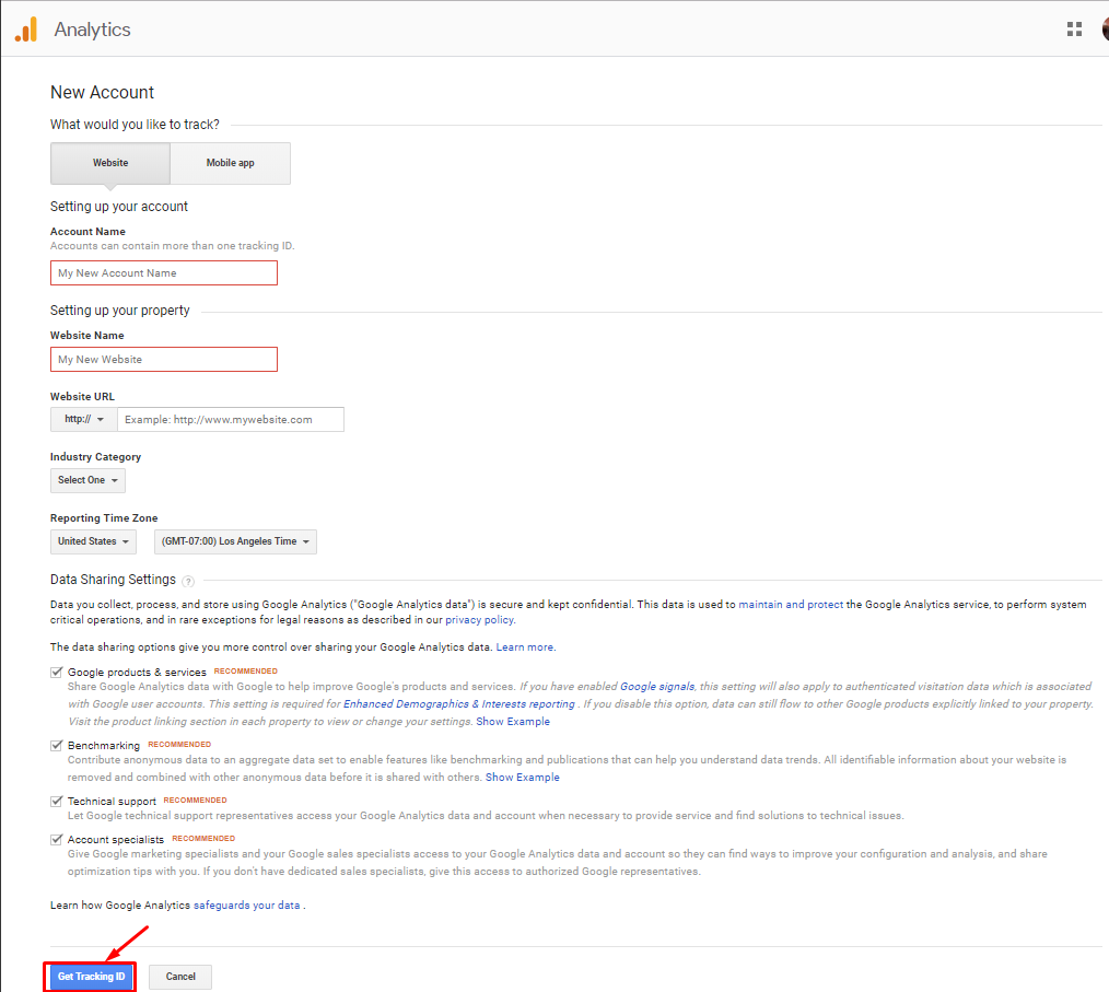 Select the object you want to track, either Website or Mobile Apps. Then, complete your account information in the New Account registration form.