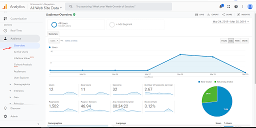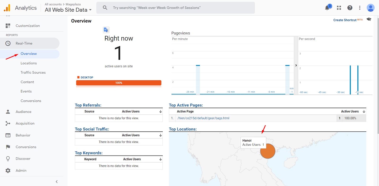 Store > Configuration > Web. For example, your site's current link domain ishttp://example.com. You configure another domain link when changing store view with the same content as http://mageplaza.com. So the tracking number of customers will be counted as 1 session. You can access toAudience > Overviewof Google Analytics to view the exact number of sessions by day.