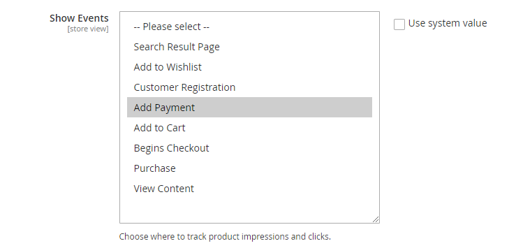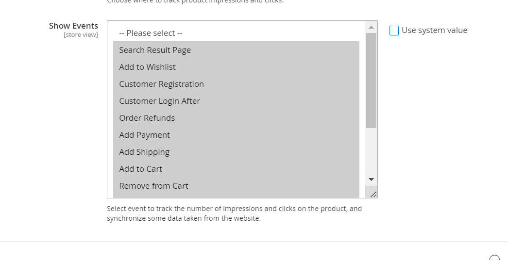 Show Events: Select one or more events in this field to track the number of impressions and clicks on the product and synchronize some data taken from the website. Events include: