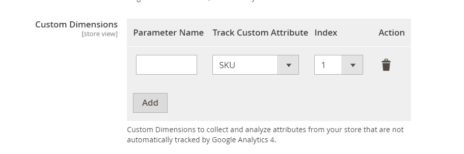 - Then go to Custom Dimensions field, click Add button and select values of Name, Track Custom Attribute, Index so that when you create New Customer Report in Google Analytics, you can collect and analyze selected store attributes that are not automatically tracked by Google Analytics.