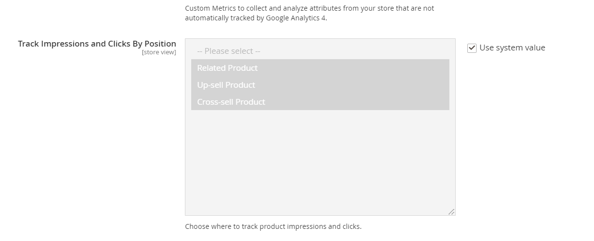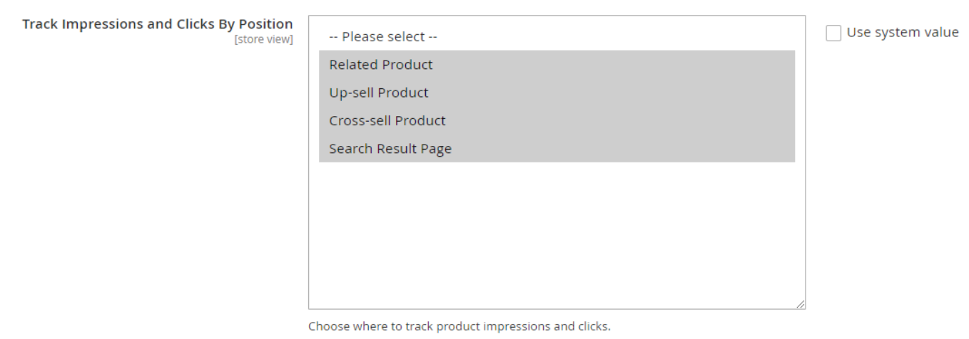 - Track Impression and Click By Positions: Choose where to track product impressions and clicks, including Related Product, Up-sell Product and Cross-sell Product
