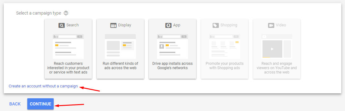 - Then select a suitable campaign type, then click on Continue. You can also create an account without choosing any campaign.