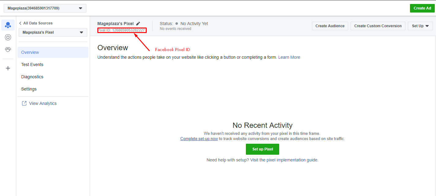 - Then, you can see a Pixel ID under your Pixel Name. That is the Facebook Pixel ID you need to get.