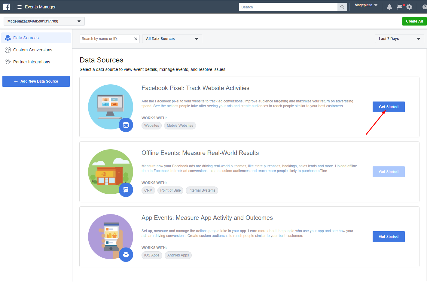 - This time, at Datasources, go to Facebook Pixel > Track Website Activities. Click to Get Started to create Facebook Pixel