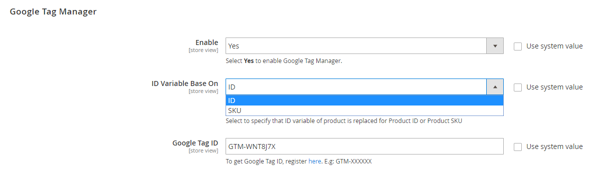 Login to the Magento Admin, choose Stores > Configuration > Mageplaza Extensions > Google Tag Manager.