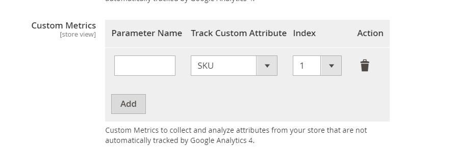 - Then go to Custom Metrics field, click Add button and select values of Name, Track Custom Attribute, Index so that when you create New Customer Report in Google Analytics, you can collect and analyze selected store attributes that are not automatically tracked by Google Analytics.