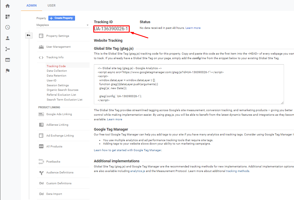 If the registration is successful, we will see the following interface and get GA Tracking ID to install in Magento.