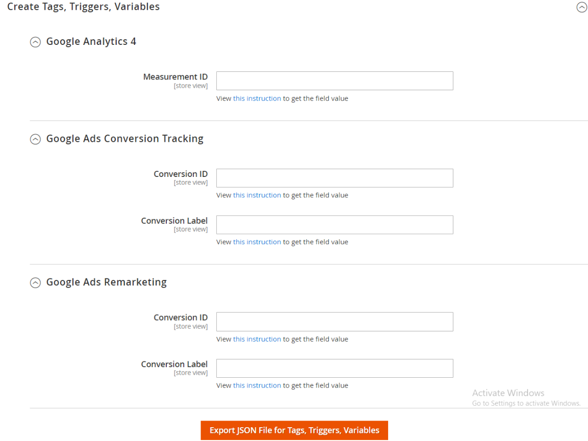 - Enter essential information to Export JSON File for Tags, Triggers, Variables such as: Measurement ID of Google Analytics 4, Conversion ID and Conversion Label of Google Ads Conversion Tracking and Google Ads Conversion Remarketing.